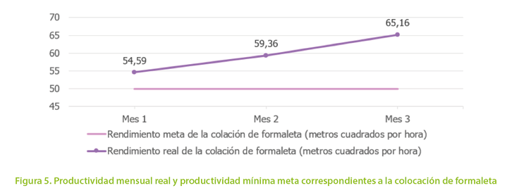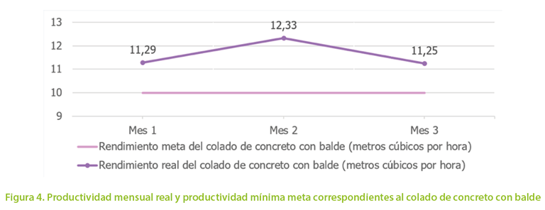 En la Figura 4, se muestra la productividad mensual real del colado de concreto y su productividad mínima meta.