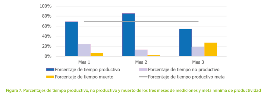 En la Figura 7, se presenta los porcentajes de tiempo productivo, no productivo y muerto de los tres meses de mediciones. En la Figura 7, también, se muestra la meta mínima de productividad.
