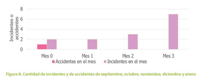 En la Figura 8, se observa la cantidad de incidentes y de accidentes asociados directamente a la operación de la grúa torre y ocurridos durante los meses de septiembre, octubre, noviembre, diciembre y enero.