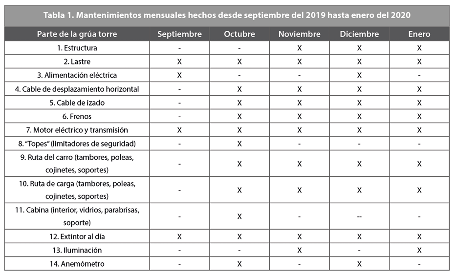 En la Tabla 1, se muestra los mantenimientos mensuales hechos desde septiembre del 2019 hasta enero del 2020. Se observa que el mantenimiento mensual hecho en septiembre no tuvo la misma amplitud adecuada a las de los otros mantenimientos mensuales. El buen mantenimiento mensual hecho a la grúa torre desde octubre hasta enero pudo contribuir a que casi no hubiera problemas mecánicos ni eléctricos durante dichos meses.