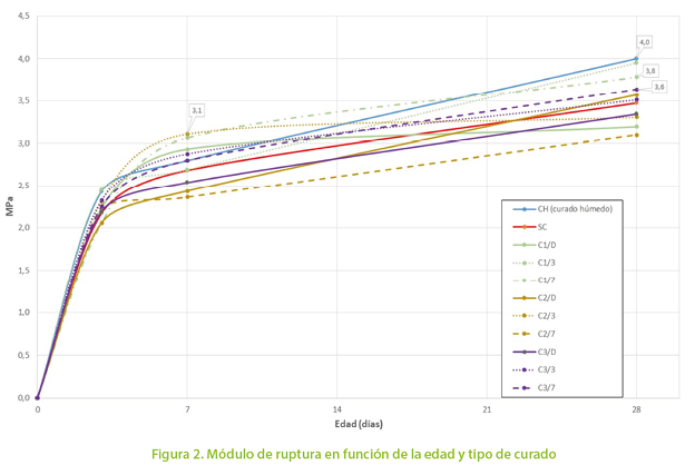 Con el producto curador no generador de membrana a base de silicatos (C1), se obtienen las resistencias más bajas a la compresión y mayor contracción al aplicar el curador al desmoldar el espécimen. Sin embargo, al ser aplicado a los 7 días luego de mantener los especímenes en el cuarto húmedo se obtiene el mejor resultado del módulo de ruptura (4,0 MPa) a los 28 días de edad.