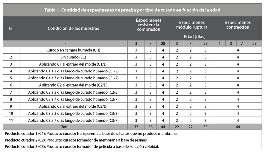 Se realizaron ensayos de laboratorio para determinar la idoneidad de los agregados, cemento y mezcla de concreto en su estado fresco y endurecido. Para los agregados, su respectivo muestreo y reducción se realiza con base a las normas ASTM D75/D75M-14 y ASTM C702/C702M-18. Para su caracterización se realizaron tres réplicas según corresponda para las normas de ensayos ASTM C40/C40M-16, ASTM C117-17, ASTM C136/C136M-14, ASTM C127-15, ASTM C128-15 y ASTM C29/C29-17a. Para el cemento se obtienen muestras representativas en base a la norma ASTM C183/C183M-16 y se caracteriza mediante la ejecución de ocho réplicas para cada uno de los siguientes procedimientos: ASTM C187-16, ASTM C191-18a, ASTM C188-17, ASTM C430-17, ASTM C1437-15 y ASTM C109-16a. Las mezclas de concreto se diseñan según el procedimiento ACI 211.1-91 para un rango de asentamiento (ASTM C143/C143M-15a) entre 75 mm a 100 mm, relación a/c (agua / cemento) de 0,58 y una resistencia a la compresión mínima de 21 MPa. El moldeo de los especímenes se ejecuta según lo descrito en la norma ASTM C192/C192M-18 para cilindros de concreto (150 mmx 300 mm) y vigas estandarizadas (150 mm x 150 mm x 500 mm). Para cada uno de las 11 batidas de concreto en su estado fresco se registró la temperatura según norma ASTM C1064/C1064-17, así como el contenido de aire según la norma ASTM C231/231M-17a. Con respecto al concreto en su estado endurecido, para determinar la resistencia a la compresión se utilizó la norma ASTM C39/C39M-18 y el procedimiento ASTM C78/C78M-18 para obtener su correspondiente módulo de ruptura. Respecto a los especímenes para el control de contracción, se fabricaron vigas (75 mm x 75 mm x 250 mm) según lo establece la norma ASTM C157/C157M-17, para los especímenes que corresponden a la condición de curado en cuarto húmedo se siguió estrictamente lo especificado en esta norma; para aquellas que utilizaron productos curadores, se modifica el procedimiento para ajustarse a la investigación. La aplicación de los productos curadores se realiza utilizando una bomba de baja presión y rodillos luego de remover los especímenes de los moldes o del cuarto húmedo según el caso de estudio. La tabla 1 muestra las condiciones de curado y la cantidad de especímenes de prueba.