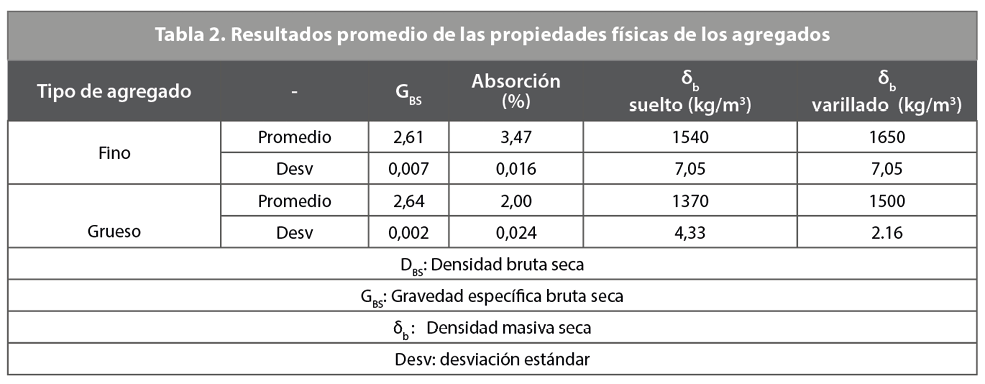 La caracterización de los agregados por medio de ensayos de laboratorio indica valores de densidad relativa acordes con agregados de peso normal (2,4 a 2,8) y de procedencia natural. (Tabla 2).
