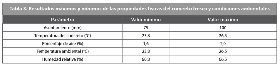 Los resultados experimentales máximos y mínimos del concreto en su estado fresco para todas las coladas indican valores aceptables de un concreto convencional para los parámetros de asentamiento, temperatura del concreto y porcentajes de aire. (Tabla 3).