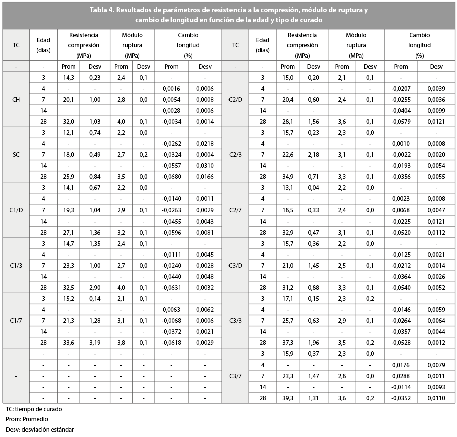 El desarrollo de resistencia a la compresión del concreto, su módulo de ruptura y cambios de longitud en función de su edad (días) desde el moldeo y en combinación con el tipo de curado se muestran en la Tabla 4, la Figura 1, Figura 2 y Figura 3.