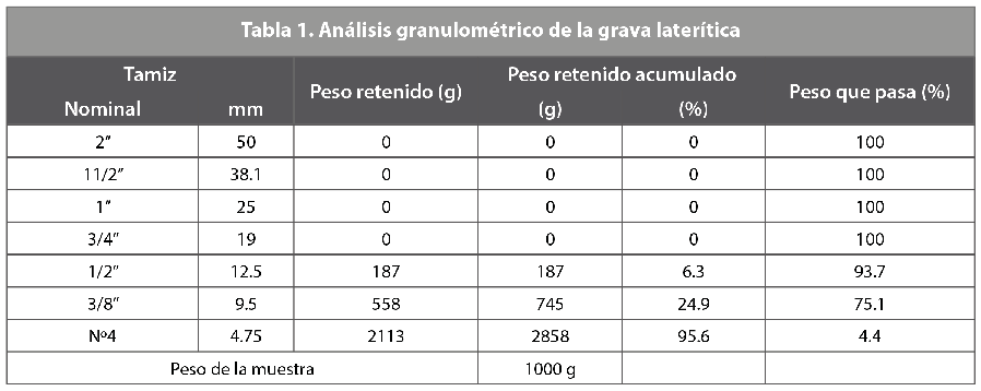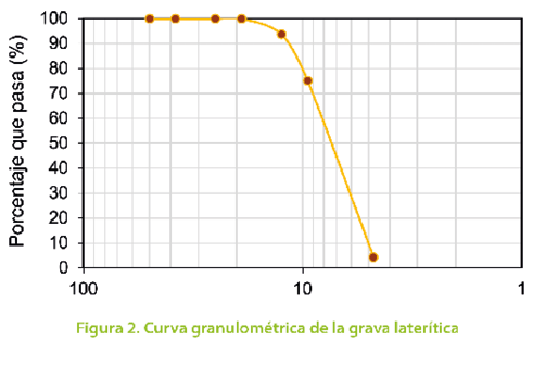 El agregado laterítico fue obtenido de Riberalta, Beni, Bolivia (Figura 1), sector caracterizado por presentar extensos depósitos de material laterítico. La Tabla 1 y Figura 2 presentan el análisis granulométrico de la grava laterítica mediante la norma ASTM C136 (ASTM, 2019). El porcentaje de absorción del agregado laterítico se determinó en 6.13% por medio de la ASTM C127 (ASTM, 2015).