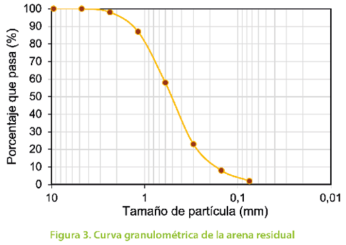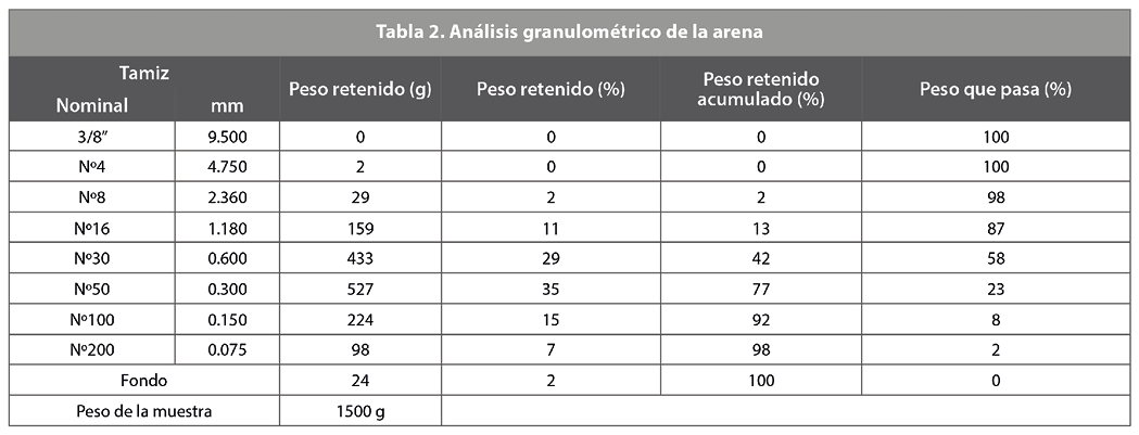 La arena utilizada fue natural, extraída de Riberalta, Beni, Bolivia. La Tabla 2 y Figura 3 presentan el análisis granulométrico de la arena, siguiendo la norma ASTM C136 (ASTM, 2019).