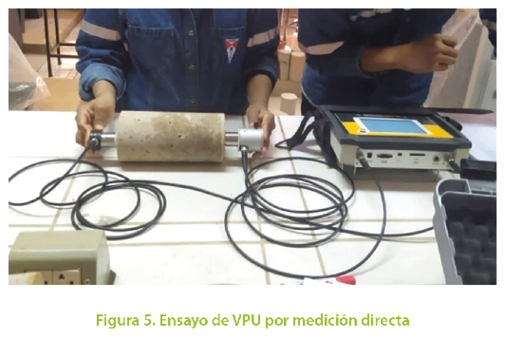 Antes de que los cuerpos cilíndricos de prueba fueran ensayados a la resistencia a la compresión, se determinó la VPU para 7 y 28 días. Se obtuvieron tres lecturas de tiempo para cada espécimen y el método de medición fue el directo (Figura 5), a fin de obtener resultados más precisos.