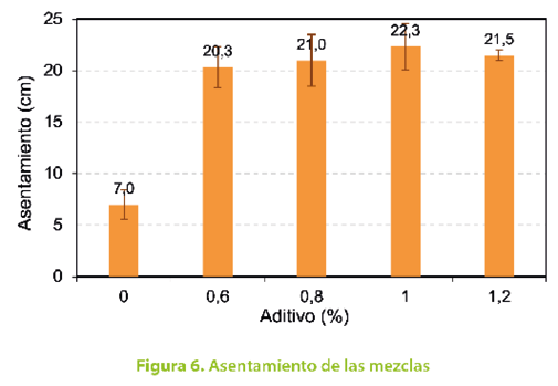 Los valores de asentamiento para las mezclas con aditivo son elevados cuando se comparan a la referencia (Figura 6), todos por encima de 20 cm, esto debido a que el aditivo es un reductor de agua y retardante, lo que provoca que la mezcla presente fluidez durante el ensayo. Se puede observar que los datos presentan un comportamiento ascendente con el aumento del porcentaje de aditivo hasta 1%, asentamiento de 22.33 cm; sin embargo, cuando el porcentaje de aditivo es el máximo (1.2%), la mezcla presentó menor asentamiento comparado a la mezcla con 1% de aditivo.