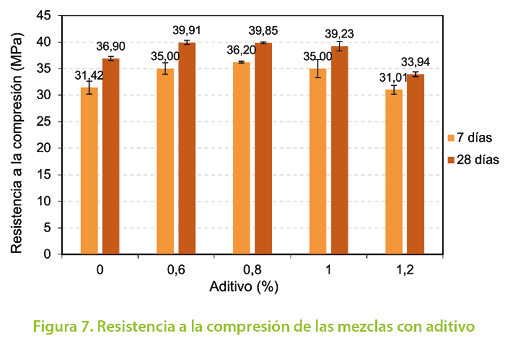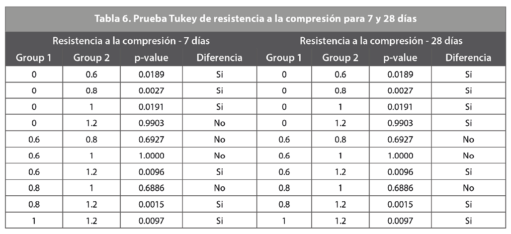 Por medio de la prueba Tukey a 7 días (Tabla 6), se observa que se presentan diferencias entre la referencia (0%) y mezclas con aditivo de 0.6, 0.8 y 1% (p-value<α). El efecto del aditivo permitiría aumentar la resistencia mecánica hasta un 1%, pero porcentajes mayores (1.2%) resultan en un valor similar a la referencia. Las mezclas con 0.6 y 0.8% de aditivo tampoco presentan una diferencia significativa, porcentajes donde se tienen los mejores valores de resistencia a la compresión a los 7 días. Para 0.6% y 1% tampoco existe diferencia, indicando que, pese a adicionar una mayor cantidad de aditivo, se obtiene una resistencia parecida a la de 0.6%, misma situación presentada para 0.8% y 1%. Existen diferencias de las mezclas con 0.6, 0.8 y 1% con la de 1.2%, señalando que este último porcentaje genera las resistencias más bajas.