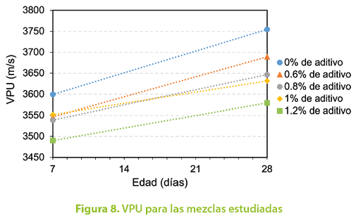 La VPU presenta una tendencia a disminuir con el aumento del porcentaje del aditivo superplastificante, esto cuando se compara con la referencia, comportamiento reportado para ambas edades, 7 y 28 días (Figura 8). Los menores valores de VPU se presentan para las mezclas con 1.2% de aditivo; mientras que, la referencia tiene los máximos valores de VPU, lo que indica que existe una incorporación de aire con el uso de aditivo superplastificante, especialmente a mayores porcentajes, influyendo en la VPU.