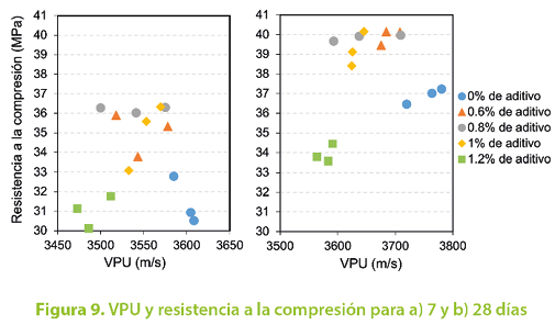 La Figura 9a presenta la relación entre la resistencia a la compresión y la VPU para las mezclas a 7 días. Se observa que las mezclas de referencia y 1.2% de aditivo presentan una resistencia a la compresión en el rango de 30-33 MPa, pero la VPU es diferente, para la referencia y 1.2% de aditivo, el rango es 3585-3609 m/s (valores altos) y 3473-3512 m/s (valores bajos), respectivamente. Ya las otras mezclas (0.6, 0.8 y 1%) tienen una resistencia a la compresión y VPU en el rango de 33-37 MPa y 3500-3578 m/s, indicando que estas mezclas no presentaron una tendencia clara sobre la influencia del aditivo en la resistencia a la compresión y VPU.