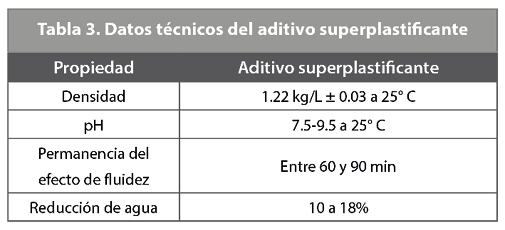 Se utilizó un aditivo superplastificante, reductor de agua de medio rango y retardador para el hormigón. La elección de aditivo superplastificante fue basada en su disponibilidad local y comercial. El aditivo no contiene cloruros y tiene un aspecto liquido color café oscuro, cumpliendo las especificaciones de ASTM C494 Tipo G (ASTM, 2019), NB 1000 (IBNORCA, 2015), NB 1001 (IBNORCA, 2015) y NB 1225001 (IBNORCA, 2017). El fabricante recomienda un uso de 0.6 a 1.2 % respecto al peso del cemento. La Tabla 3 presenta características adicionales del aditivo superplastificante.