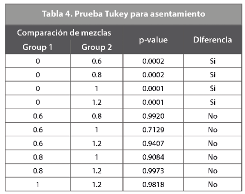 Para un análisis más detallado se utilizó el análisis de varianza (ANOVA) para un α de 0.05, donde el p-value fue 7.99E-05 (<α), por tanto, existen diferencias significativas entre las medias del asentamiento de las mezclas. Mediante la prueba Tukey (Tabla 4) se puede observar que las medias obtenidas en las mezclas sin aditivo (0%) presentan diferencias significativas en comparación con las mezclas con aditivo (0.6, 0.8, 1 y 1.2%), ya que p-value<α. Pero no existen diferencias en el asentamiento de todas muestras que tienen aditivo, p-value>α, esto indica que efecto del aditivo permite obtener fluidez en las mezclas, provocando que los asentamientos sean mayores, por encima de 20 cm, indistintamente del porcentaje de aditivo utilizado, 0.6-1.2%, rango recomendado por el fabricante.