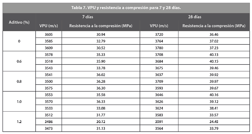 Los resultados de VPU son detallados en la Tabla 7, comparando el promedio de las tres mediciones de VPU con la resistencia a la compresión del respectivo cuerpo de prueba cilíndrico.