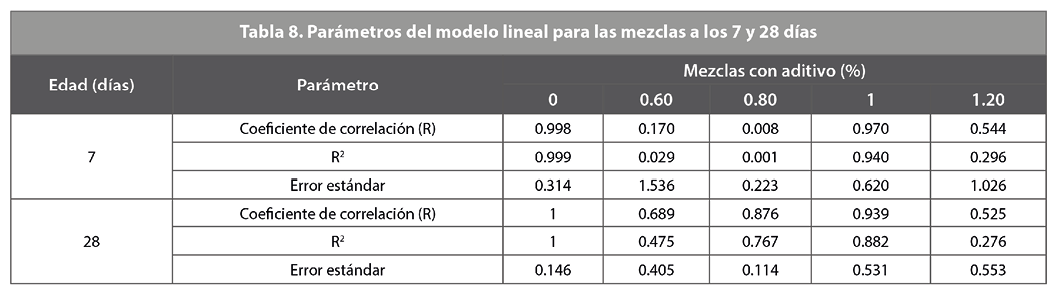 Los resultados de VPU son similares, el máximo valor es de 3609 m/s para la mezcla de referencia; mientras que, el valor más bajo (3473 m/s) se presenta para la mezcla de 1.2% de aditivo, existiendo una diferencia de solo 136 m/s en la VPU. Para verificar si los resultados siguen una tendencia lineal con la resistencia a la compresión se realizó un análisis de regresión lineal por edad y para cada porcentaje de aditivo (Tabla 8). Solo la referencia (0%) y la mezcla con 1% de aditivo presentan modelos lineales con un coeficiente de correlación (R) alto. El R obtenido de la referencia es 0.9998 y 1, para 7 y 28 días, respectivamente. En el caso de 1% de aditivo el R es 0.970 y 0.939, para 7 y 28 días, respectivamente. Awoyera et al. (2017) encontraron similitud entre los valores de resistencia a la compresión y UPV de morteros con material laterítico y residuos de cerámica, a mayor resistencia a la compresión se tiene mayor VPU, debido a que la compacidad de los materiales afecta el tiempo de tránsito del pulso ultrasónico.