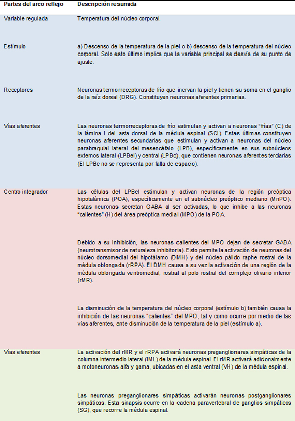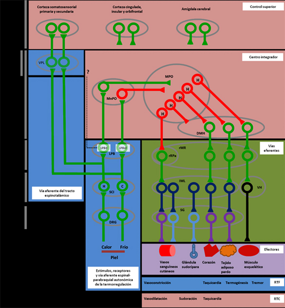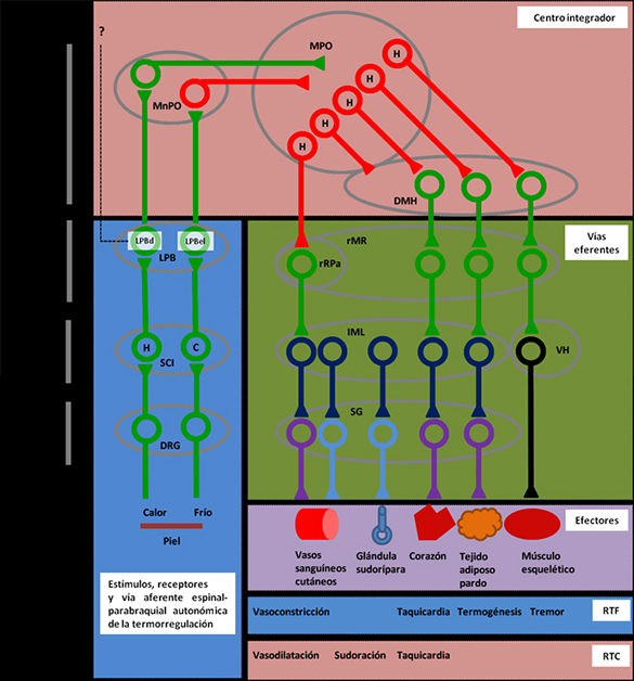 En el caso específico de la vía eferente que induce vasoconstricción cutánea, parte de la RTF, se ha señalado que esta depende de neuronas del rMR (posiblemente ubicadas en el rRPa) cuya actividad es dependiente de neuronas inhibitorias del MPO y no de las neuronas excitatorias del DMH, como ocurre con otros componentes de la RTF. Esta excepción se sustenta anatómicamente, pues se han detectado neuronas secretoras de GABA en el MPO que se proyectan directamente al rRPA del rMR, mientras que otras se proyectan al DMH. Este fenómeno ilustra con más claridad la existencia de órganos efectores termorreguladores activados por vías eferentes paralelas. También se debe aclarar, que en el rRPa hay adicionalmente neuronas que sí son activadas por el DMH, pero estas no causan activación de la vasoconstricción cutánea, sino que median la activación de los otros órganos efectores de la RTF, tal y como lo hacen las neuronas del resto del rMR. Por motivos de espacio, esta última idea no está representada en la figura 2 (Morrison & Nakamura, 2011; Morrison et al., 2008; Nakamura, 2011; Romanovsky et al., 2009).