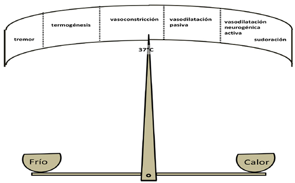 La “termogénesis obligatoria” (aquella resultante de las funciones metabólicas básicas) puede mantener estable la temperatura corporal sin la participación de mecanismos adicionales. A la temperatura ambiental más baja en que ocurre lo anterior se le denomina temperatura de termoneutralidad. En especies pequeñas, como roedores, debido a su gran relación área de superficie corporal / volumen corporal, que facilita la pérdida de calor, la temperatura de termoneutralidad es relativamente alta (unos 30 °C). En el caso de especies más grandes como el ser humano, esta temperatura es de unos 23 °C (López, Alvarez, Nogueiras, & Diéguez, 2013). La presente revisión tiene como objetivo explicar los diferentes mecanismos fisiológicos que permiten el mantenimiento de la temperatura corporal en su rango compatible con la vida, cuando la temperatura ambiental es diferente a la de termoneutralidad o cuando las funciones metabólicas van más allá de las básicas, como en el caso del ejercicio. Estos mecanismos se pueden dividir en aquellos de tipo reflejo (o autonómico) y de conducta (o voluntario). En los mecanismos reflejos, el sistema nervioso autónomo activa una serie de respuestas termorreguladoras ante variaciones de la temperatura corporal, de forma automática y sin mediación de la voluntad del sujeto. En los mecanismos de conducta, el individuo toma conscientemente ciertas decisiones cuando siente que pierde su confort térmico, aunque su temperatura corporal no necesariamente haya cambiado. Ambos tipos de regulación contribuyen a conservar la homeostasis térmica.