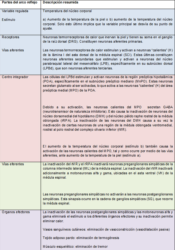 En la figura 1 se representa un esquema general de la termorregulación refleja y en la figura 2 el mismo mecanismo, pero de una forma detallada. El significado de las abreviaturas utilizadas en la figura 2 se explica en la tabla 1.