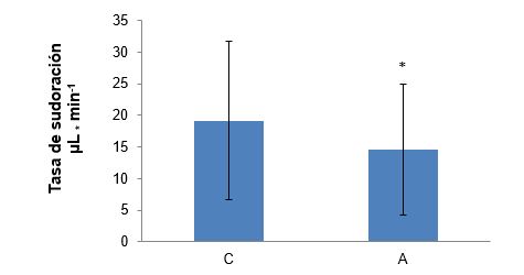 Figura 2. Resultado del ANOVA de una vía. C > A. Sin antitranspirante (C) (19,2 ± 12,6 μL * min-1), con antitranspirante (A) (14,6 ± 10,3 μL * min-1); *p = 0,001