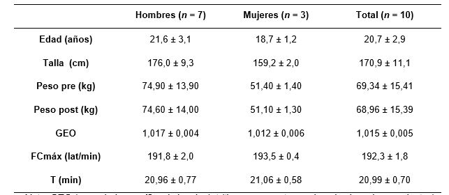 Análisis estadístico. Para caracterizar la muestra se realizó estadística descriptiva para la edad, peso corporal (antes y después), talla, t, gravedad específica de la orina (GEO) y frecuencia cardíaca máxima de los sujetos (ver tabla 1). Se realizó un ANOVA de una vía para muestras relacionadas, con la condición (A o C) como variable independiente y la tasa de sudoración como variable dependiente.