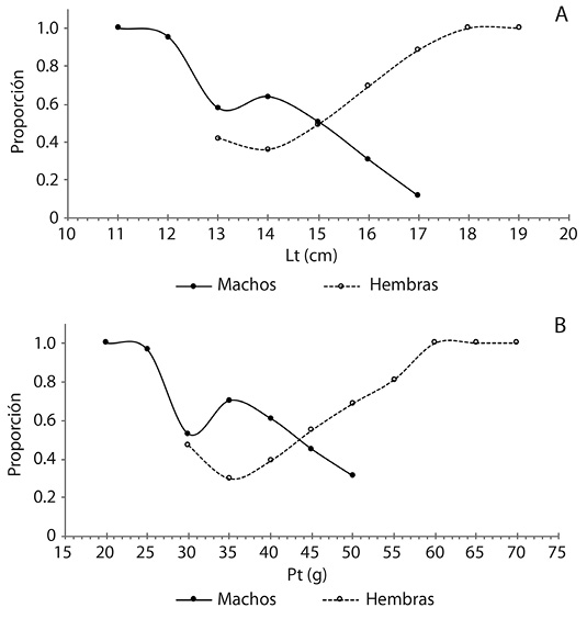La proporción de hembras y machos respecto de la talla (Lt) y el peso total (Pt) es diferencial, lo que muestra un dimorfismo asociado a estas variables. En el caso de la Lt, sólo en el rango de los 13 a los 17 cm se mantiene la proporción 1:1 de hembras y machos, en las tallas inferiores a los 13 cm los machos predominan, mientras que en tallas mayores a los 14 cm, son las hembras las predominantes (Fig. 4A). Al efectuar el mismo análisis respecto del peso total (Pt), entre los 25 y 45 g se encontró una proporción 1:1 entre ambos sexos, en los peces menores a los 25 g es mayor la proporción de machos, mientras que en los ejemplares mayores de 45 g, son las hembras las predominantes (Fig. 4B).