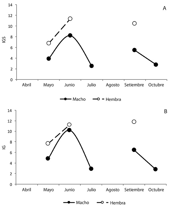Fig. 7. Índice gonadosomático (IGS, A) e índice gonádico (IG, B) en hembras y machos de Pseudocurimata lineopunctata, capturados en río Anchicayá, Valle del Cauca, Colombia.