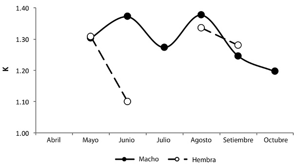 Fig. 8. Índice de condición (K) en hembras y machos de Pseudocurimata lineopunctata,