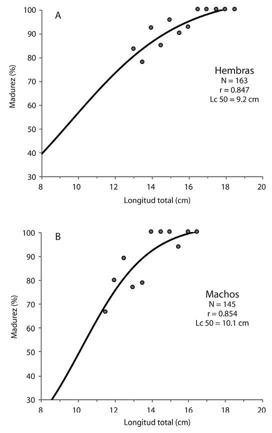 La captura de individuos no abarcó toda la distribución de tallas, sin embargo, con los datos existentes, se pudo ajustar un modelo logístico que permite inferir una TPMS, que se estableció con un total de 163 hembras y 145 machos, correspondiente a los meses de mayo a septiembre. La TPMS para hembra fue determinada en 9.2 cm y para machos en 10.1 cm de Lt (Fig. 9).
