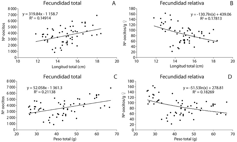 Para determinar la fecundidad se analizaron 60 hembras, de una Lt promedio de 14.9 ± 1.5 cm y un Pt promedio de 43 ± 11.3 g. La fecundidad absoluta fue de 3 598 ovocitos/♀ y una fecundidad relativa de 84 ovocitos/g♀ (Cuadro 1). A medida que las hembras eran de mayor tamaño, producían una mayor cantidad de ovocitos, donde la fecundidad absoluta en función de la Lt y Pt se ajustó a un modelo lineal (Fig. 10A, Fig. 10C), mientras que la producción de ovocitos/kg de hembra (fecundidad relativa) se ajustó a un modelo logarítmico (Fig. 10B, Fig. 10D).