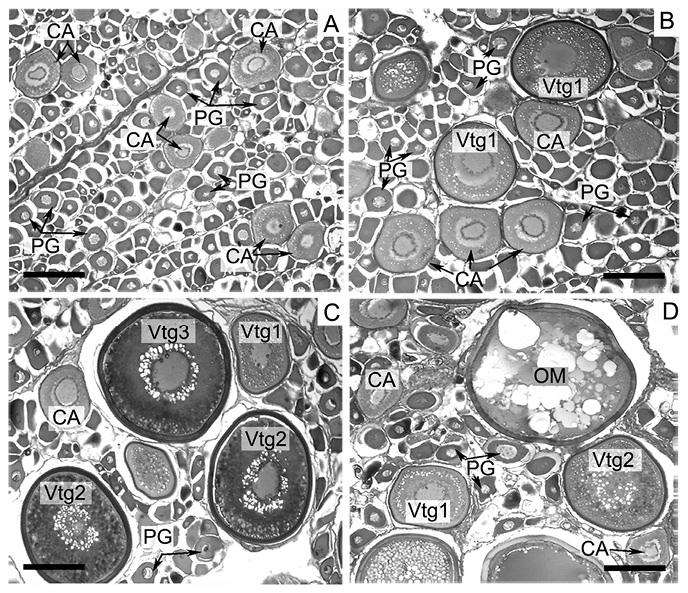 PG = primary growth oocyte; CA = cortical alveolar oocyte; Vtg1 = primary vitellogenic oocyte; Vtg2 = secondary vitellogenic oocyte; Vtg3 = tertiary vitellogenic oocyte; OM = oocyte maturation; G = G statistic; d.f. = degrees of freedom; p = probability value; * = highly significant statistical difference (P < 0.05).
