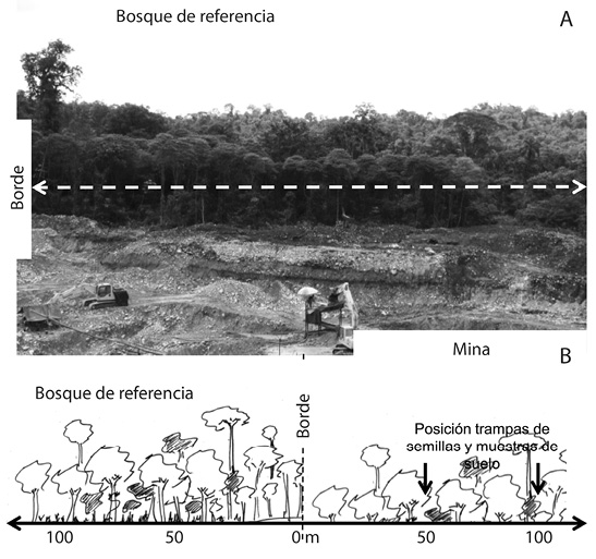 Muestreo del banco de semillas: En diciembre 2014, en cada mina seleccionada se tomaron muestras de suelo hasta una profundidad de 5 cm, con la ayuda de un barreno de 8 cm de diámetro (N = 54 por mina), tomando como puntos de muestreo los de ubicación de las trampas de semillas, a 50 y a 100 m de distancia desde el bosque adyacente (N = 27 muestras por distancia y mina). Estas muestras de suelo fueron trasladadas al laboratorio de Biología de la Universidad Tecnológica del Chocó, donde se secaron a temperatura ambiente para luego ser procesadas y separar las semillas del suelo con la ayuda de un tamiz (luz < 5 mm).