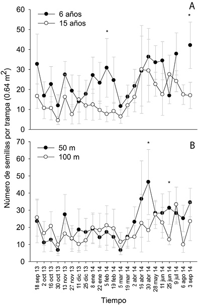 Lluvia de semillas: La cantidad de propágulos (número de semillas por trampa por muestreo) que llegaron a las minas vía lluvia de semillas varió con el período de abandono de la mina (ANOVA de medidas repetidas: F1,104 = 18.4, P < 0.0001), siendo mayor en la mina de 6 años (24.8 ± 2.16) que en la mina de 15 años (15.3 ± 1.84). No se encontraron diferencias estadísticamente significativas entre la cantidad de semillas recolectadas a 50 m (21.6 ± 2.16) y a 100 m (18.1 ± 1.84) de distancia del bosque adyacente (F1,104 = 1.83, P = 0.17). Sin embargo, las diferencias encontradas entre minas de distinta edad, fueron superiores a mayor distancia desde el bosque adyacente (interacción distancia × edad-mima: F1,104 = 34.5, P < 0.0001; Cuadro 1). La abundancia de la lluvia de semillas fluctuó a través del tiempo (F22,2228 = 13.7, P < 0.0001) con variaciones significativas entre las minas de distintas edades (interacción tiempo × edad-mina: F21,2228 = 2.49, P = 0.0003; Fig. 2A) y entre las diferentes distancias desde el bosque adyacente (interacción tiempo × distancia: F22,2228 = 2.42, P = 0.0001; Fig. 2B).