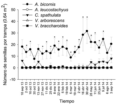 Fig. 3. Contribution of propagules of the species that constitute the seed rain in abandoned mines in Raspadura, Unión Panamericana, Chocó, Colombia. Data as mean ± 2 standard error. Asterisks (*) over the points indicate statistically significant differences among species for different time instants (HSD Tukey, P < 0.05).