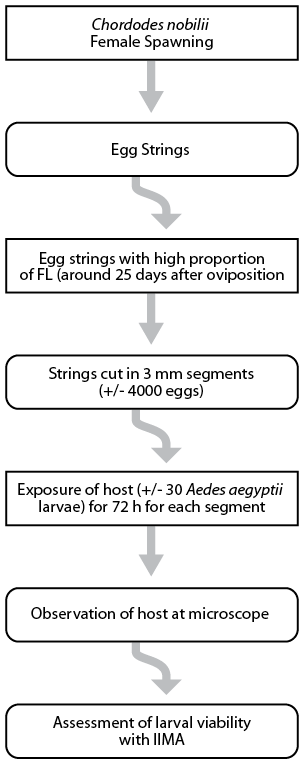 Determination of viability of Chordodes nobilii individuals under study: Figure 1 is a schematic diagram of the methodology used. For evaluation of the gordiids’ infective capacity– and therefore their survival –Aedes aegypti larvae, reared in the laboratory, were used as hosts. These larvae were placed in containers (N= 30 A. aegyptii larvae per container, with 12 mL of dechlorinated tap water and wheat germ as food) along with 3-mm-long C. nobilii egg-string segments containing ca. 4000 C. nobilii individuals. Those egg-string segments first had been checked to confirm that ≥ 50 % were in the free-larval stage. In this way, we could assume a similar exposure rate for each sample. For the entire study, a total of 90 egg-string segments were used. After a 72 h exposure to the C. nobilii larvae, the A. aegypti larvae were fixed in 70 % (v/v) aqueous ethanol. The mosquito larvae were then dissected under the light microscope in order to quantify the C. nobilii larvae in the body cavities. The IIMAs were calculated as the total number of C. nobilii larvae present divided by the total number of A. aegypti larvae examined (Bush et al., 1997).