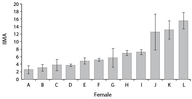 Fig. 2. Infective capacity of Chordodes nobilii larvae for Aedes aegypti larvae with respect to the female that made the oviposition. In the figure, the average IIMA on the ordinate for each of the C. nobilii progenitor females indicated on the abscissa. The error bars represent the SDs.