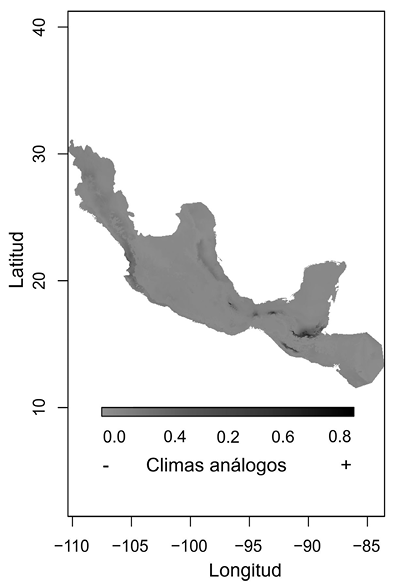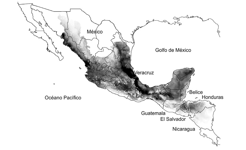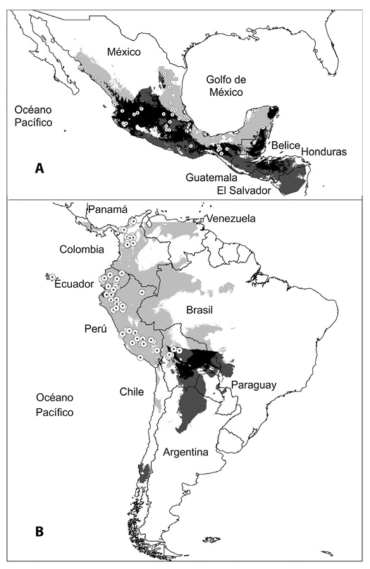 Seguidamente, se generaron dos MNE y sus correspondientes proyecciones, es decir, se corrió el MNE en México que representa el área de domesticación y se proyectó en Suramérica (que representa el centro de origen). Posteriormente, se generó un MNE en Suramérica (origen) y se proyectó a México (domesticación) con la finalidad de identificar la superposición geográfica de las condiciones ambientales en ambas regiones. Para correr los modelos, se delimitó el área de accesibilidad o “M” (sensu Soberón & Peterson, 2005) con base en las provincias biogeográficas definidas por Morrone (2014) y Löwenberg-Neto (2014). Específicamente, en el centro de origen se incluyó la región Neotropical formada por los países de Panamá, Venezuela, Colombia, Ecuador, Perú, Bolivia, Chile, Argentina Paraguay y Brasil. Para el caso del área de domesticación, la “M” se delimitó con base en las siguientes provincias biogeográficas: Xerófila mexicana, Pacífica, Mesoamericana de Montaña, Caribe y Guajira, desde México hasta Nicaragua.