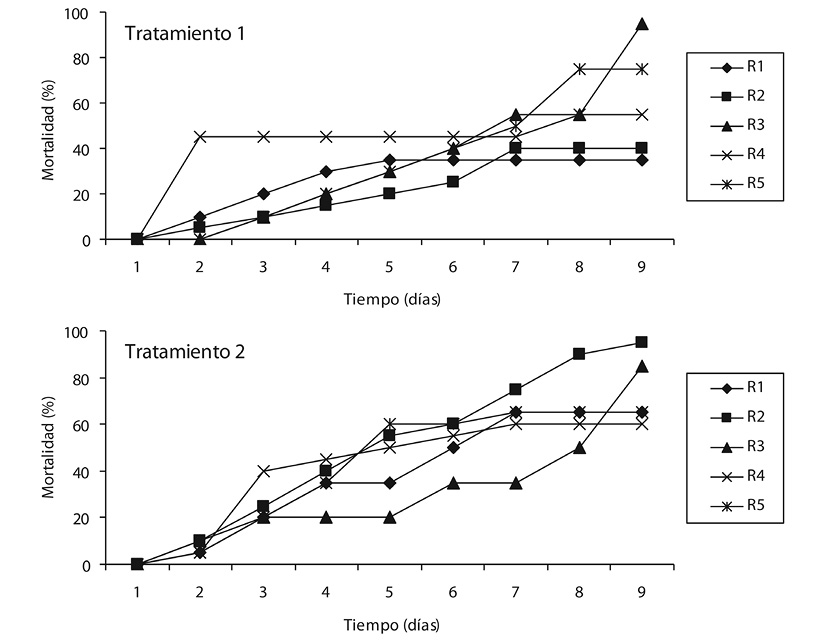 El índice de correlación de Spearman mostró que, en ambos tratamientos, la mortalidad presentó correlación positiva únicamente con la temperatura y con el tiempo, mientras que la salinidad y el oxígeno disuelto no mostraron correlación con la mortalidad (Tabla 2). Los porcentajes de mortalidad al final del ensayo en las cinco réplicas fueron 35 %, 40 %, 95 %, 55 % y 75 % para el tratamiento 1 (enero) y 65 %, 95 %, 85 %, 60 %, 65 % para el tratamiento 2 (noviembre). La figura 1 muestra el incremento de la mortalidad a lo largo del tiempo, la cual, fue mayor en el tratamiento 2 (74 %) que en el tratamiento 1 (60 %).