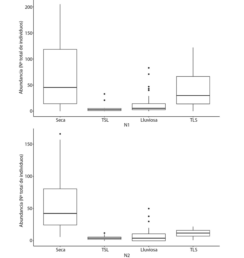 Para ambos sitios de muestreo, la abundancia de macroinvertebrados acuáticos varió según el periodo del año, de esta forma, se observó una mayor abundancia durante el periodo seco, mientras que, durante la transición de seco a lluvioso, se registró la menor abundancia de organismos (PERMANOVA, F=174.989; p=0.001; Fig. 1). Además, no hubo diferencia significativa en la abundancia de macroinvertebrados acuáticos entre los sitios (PERMANOVA, F= 2.1547; p=0.07) (Fig. 3).