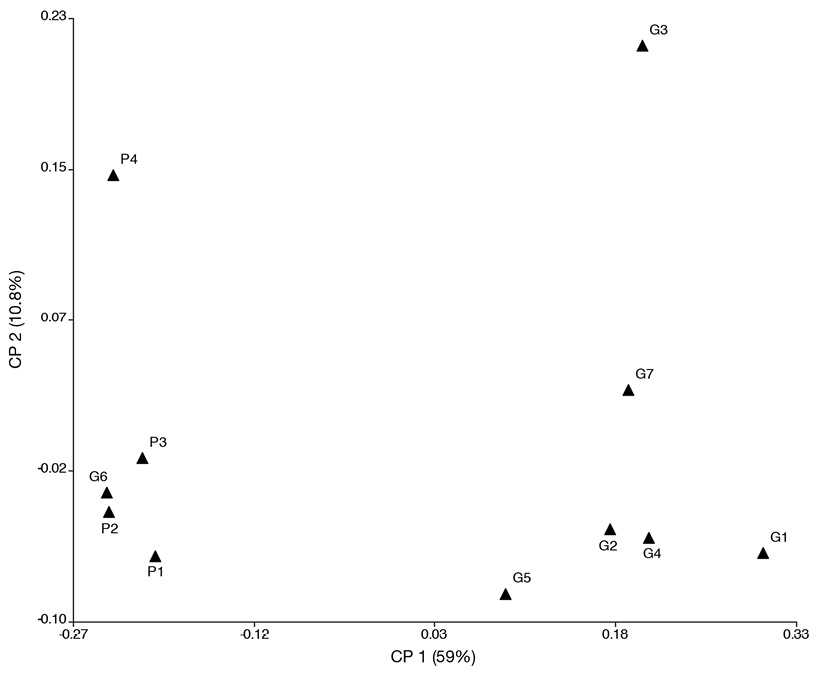 El ACoP dio como resultado dos componentes que explican el 70.7 % de la varianza (Fig. 3); este agrupa a las estaciones de muestreo en dos regiones claramente diferenciadas; por un lado los ubicados en el bofedal P (P1, P2, P3 y P4) a los cuales se agrega G6 (bofedal G) y por el otro, las estaciones correspondientes al bofedal G (G1, G2, G3, G4, G5 y G7), lo que indicaría la existencia de diferencia entre los ensambles hallados en los dos bofedales, además de que G6 es diferente dentro del bofedal G. El análisis NP-MANOVA confirmó lo hallado en la prueba de coordenadas principales al comparar las estaciones de muestreo (F=7.927; p=0.0001).