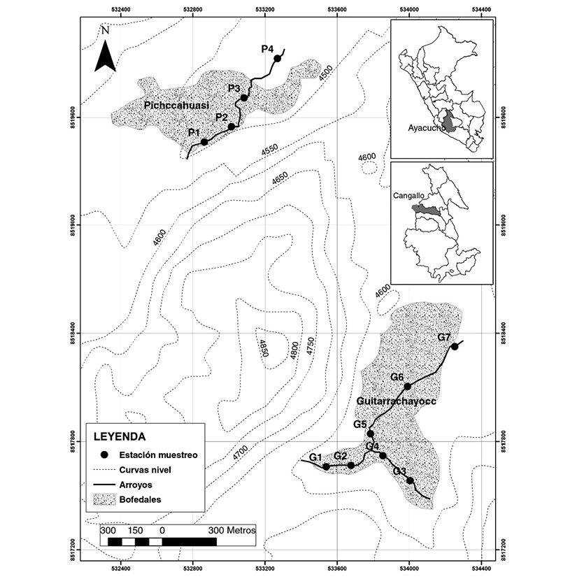 Área de estudio: El presente estudio se realizó en arroyos asociados a dos bofedales, denominados Guitarrachayocc (G) y Pichccahuasi (P), ubicados en la ecorregión altoandina de Perú (Tabla 1). Esta zona corresponde a la tundra pluvial – alpino subtropical, caracterizada por ser generalmente fría y seca, con biotemperatura media anual mínima de 1.5 ºC y máxima de 3 ºC, precipitación anual entre 500 a 1 000 mm de marcada estacionalidad y con promedio de evapotranspiración potencial que varía entre 0.125 a 0.25 veces el valor de precipitación (ONERN, 1976). Los bofedales evaluados se localizan en la naciente del río Apacheta que pertenece a la cuenca del Mantaro; este último da origen al río del mismo nombre, posteriormente al río Ene, Ucayali y finalmente el Amazonas antes de desembocar en el mar Atlántico. Los bofedales distan 1.5 km, uno de otro (Fig. 1), cuyos efluentes se unen cuenca abajo, para formar el río Supaymayo, principal tributario del río Apacheta.