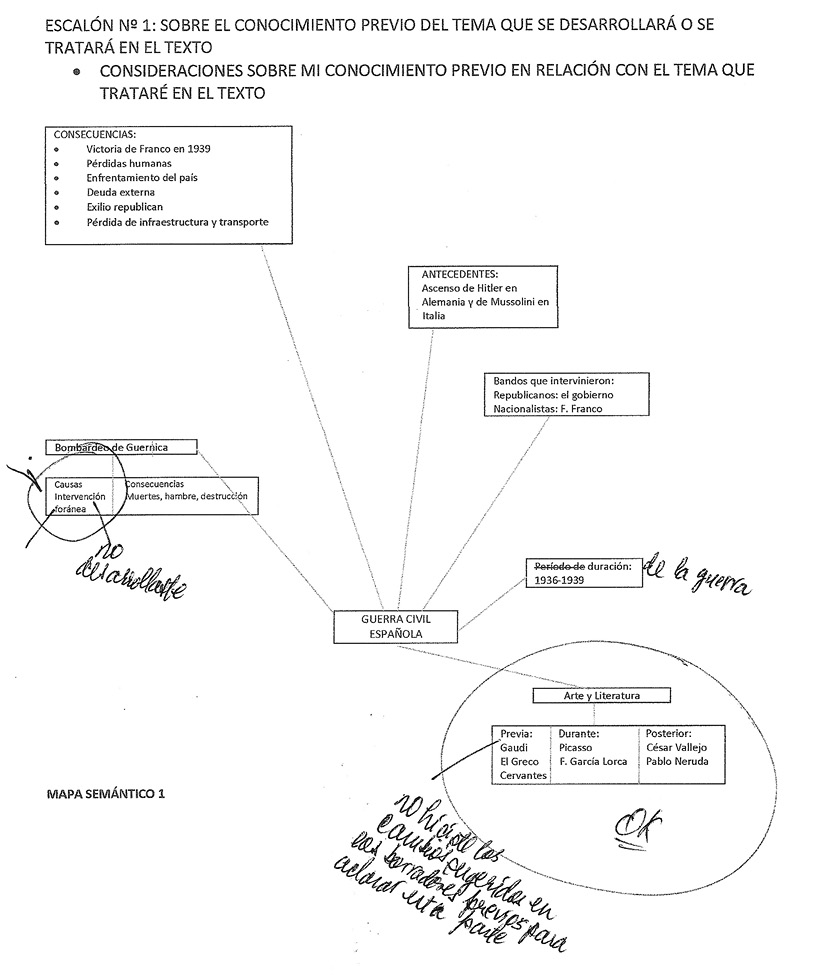 El mapa semántico realizado por Mayela y revisado y corregido por la docente es una muestra de la actividad inicial que los estudiantes realizaron en las sesiones de clase durante la etapa de prelectura y antes de abordar el TB. Mayela reflejó su conocimiento a partir de lo que ella conocía, ya que la Guerra Civil Española es un tema que está incluido en el contenido programático de una de las asignaturas del pénsum de estudios.