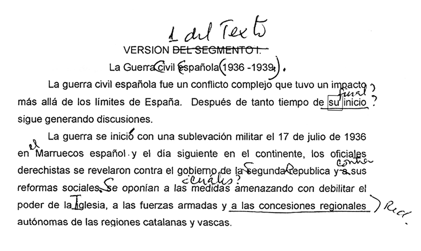 Durante las sesiones de clase, se observó cómo los estudiantes, guiados por la docente, señalaban las dificultades que ellos encontraron en el texto escrito en inglés, en relación con los aspectos gramaticales y de vocabulario. En una sesión de clase, los estudiantes, juntamente con la docente, analizaron el contenido del primer segmento del TB (Spanish Civil War exhibition), con el fin de conocer cuánto habían comprendido. Para ello, Julia les solicitó a algunos estudiantes que leyeran sus versiones escritas sobre lo que habían comprendido. Luego de que cada uno de ellos terminó de leer su versión, la docente y los estudiantes analizaron el contenido de las versiones, deduciendo, en algunos casos, que muchas de estas versiones eran traducciones literales o traducciones de cada una de las palabras que contenía el texto. Estas traducciones, según Julia, interrumpían la comprensión del texto y, en algunos casos, reflejaban una tergiversación del contenido.