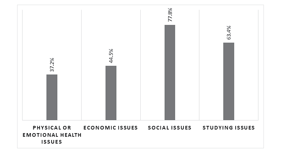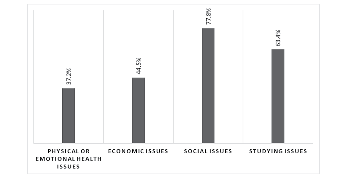 It is noticeable that COVID-19 lockdowns impact students' daily lives. First, they weighed up the physical or emotional health area as the less affected life issue (37.2%). Subsequently, the figure identifies economic and studying issues as somewhat affecting students, 44.6% and 63.4%, respectively. Ultimately, students recognized social issues as the most altered area of their lives (77.8%). In sum, students manifested how the pandemic has limited their social interactions among friends and relatives due to quarantine and social distancing guidelines.